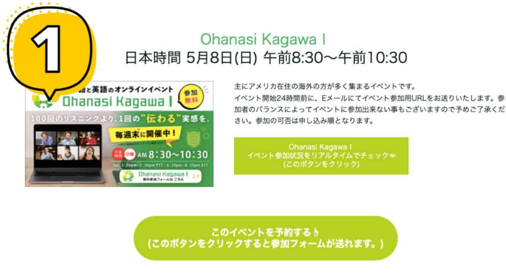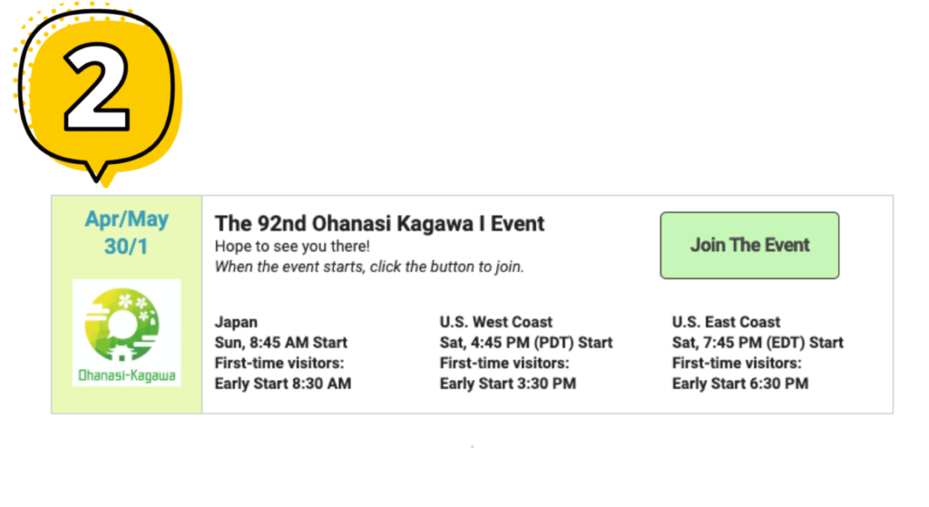 主にアメリカ在住の海外の方が多く集まるイベントです。イベント開始24時間前に、Eメールにてイベント参加用URLをお送りいたします。参加者のバランスによってイベントに参加できない事もございますので予めご了承ください。参加の可否は申し込み順となります。
